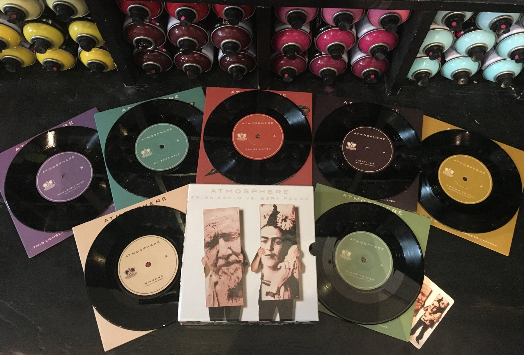 This 7" boxset contains seven different 7" vinyl, each song featuring individualized artwork by Dave Quiggle printed on full-color vinyl jackets, surrounded by a custom printed hard slipcase. Each record contains the original track b/w the accompanying instrumental. Guaranteed to be the perfect Holiday gift for any Atmosphere fan.