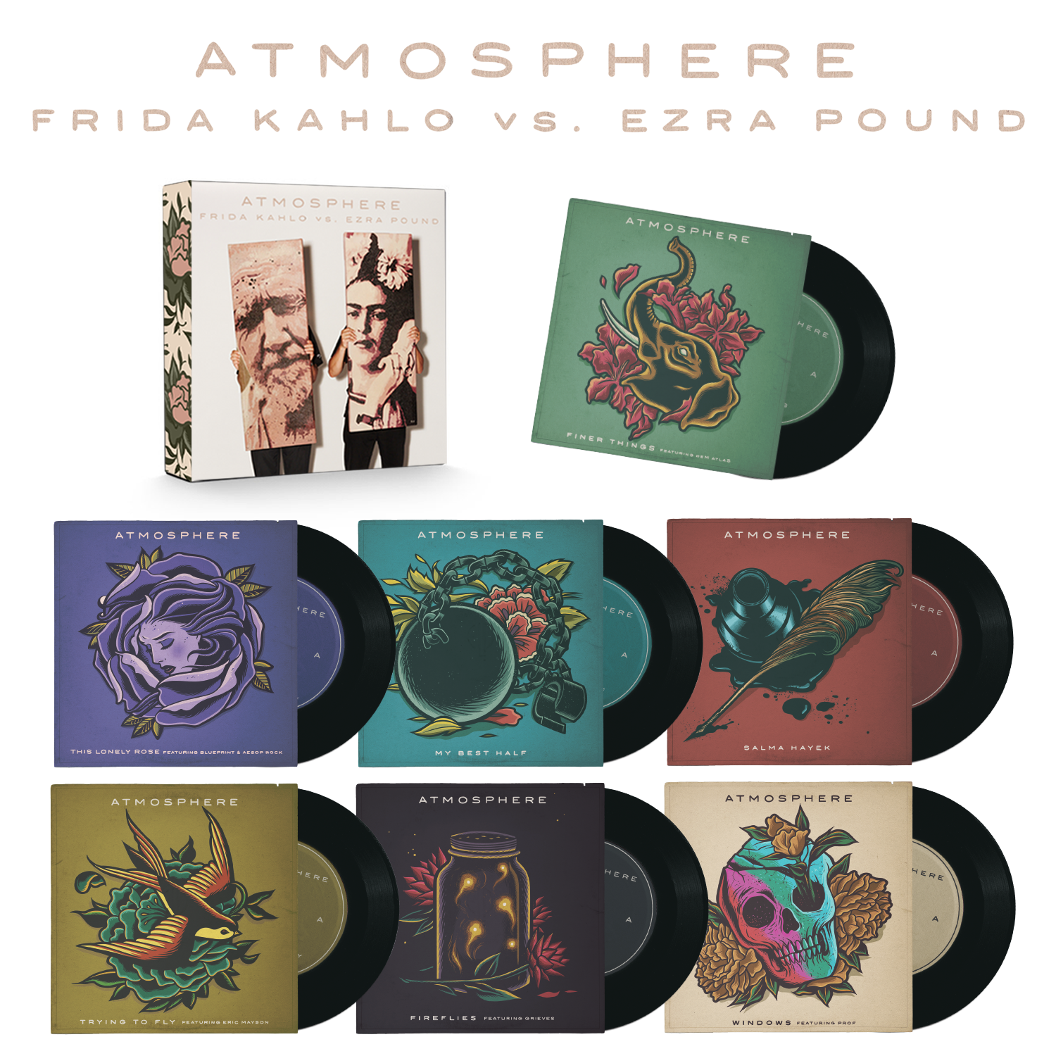 Now packaged together as Frida Kahlo vs. Ezra Pound, these singles are available for the first times as a limited edition 7" boxset and on CD. Featuring guest appearances from Aesop Rock, Blueprint, Grieves, Prof, deM atlaS & Eric Mayson.